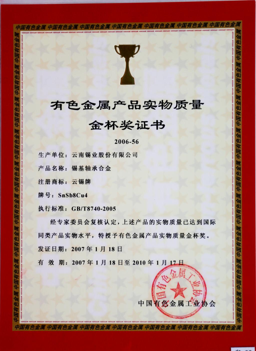 云錫牌錫基軸承合金獲有色金屬實(shí)物質(zhì)量金杯獎(jiǎng)