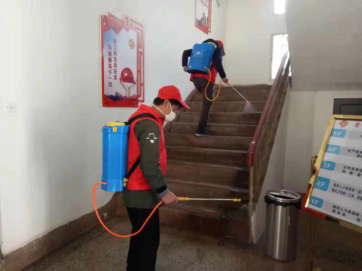 青年志愿者對辦公和生活區(qū)做好消毒防控工作