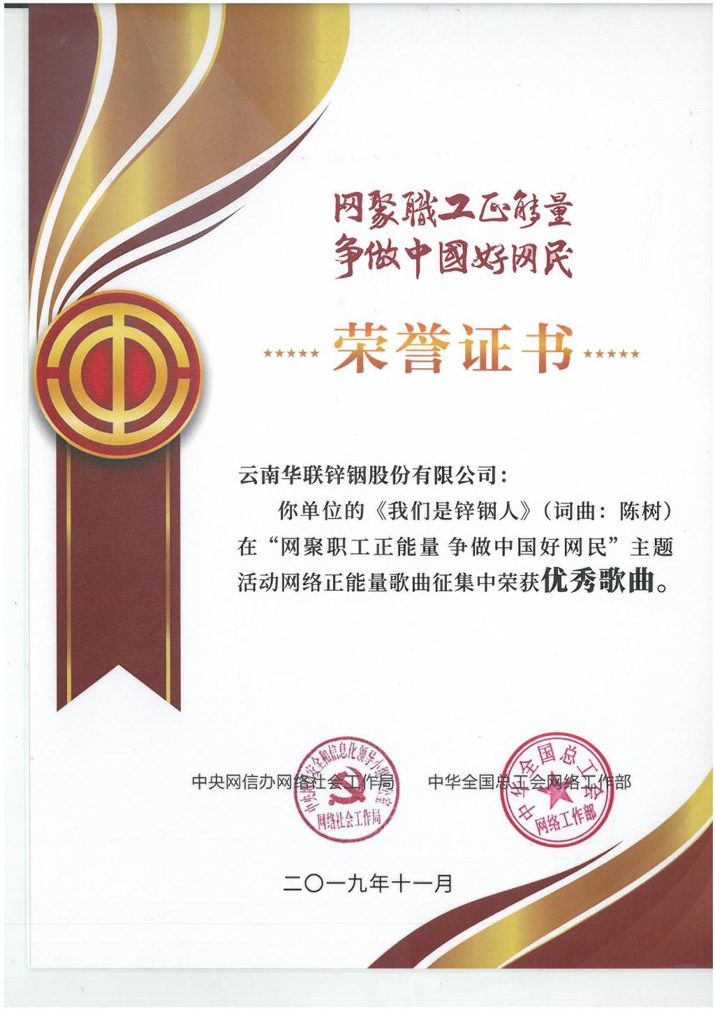 近期,華聯(lián)鋅銦公司形象歌曲—《我們是鋅銦人》MV在全國(guó)“網(wǎng)聚職工正能量 爭(zhēng)做中國(guó)好網(wǎng)民”主題活動(dòng)網(wǎng)絡(luò)正能量歌曲征集中榮獲優(yōu)秀歌曲。