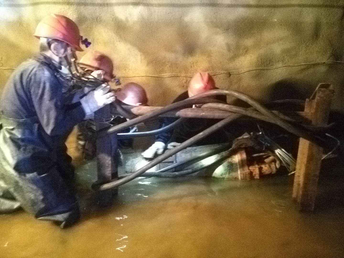 1700米中段,2公里多的上班路變成了一片汪洋,巷道、生產設備被洪水淹沒。由于水流湍急,水位持續(xù)上漲,救援搶險工作進展緩慢。危難關頭,干部職工脫下身上的衣物,就淌進了齊腰深的洪流中,一路摸索前行,設法向生產設備靠近,最終將被淹沒的設備搶救出來。