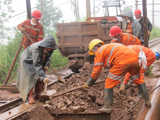 老廠分公司紅塘子鐵道運(yùn)輸線路是馬鹿塘坑出礦的主要運(yùn)輸線路,承擔(dān)著80%的礦量運(yùn)輸任務(wù)。8月3日,由于連續(xù)多日強(qiáng)降雨,老廠分公司紅塘子鐵道運(yùn)輸線路段出現(xiàn)局部陷落問(wèn)題,運(yùn)輸線路生產(chǎn)受阻。對(duì)此,敢打硬仗的馬坑干部職工在洪災(zāi)面前不氣餒,困難面前不低頭,以泰山壓頂不彎腰的氣魄與暴雨奮力搏斗,經(jīng)受住了一場(chǎng)特殊的考驗(yàn),譜寫(xiě)了一曲“狂風(fēng)暴雪何所懼,奮力抗災(zāi)保生產(chǎn)”的樂(lè)章。