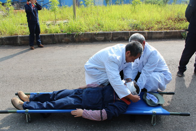 反恐小組趕到出事地點(diǎn)后,警戒保衛(wèi)組立即組織現(xiàn)場(chǎng)無(wú)關(guān)人員撤離,同時(shí)設(shè)置警戒線。副總指揮何文勇向車內(nèi)的“暴恐分子”喊話,要求他們放棄抵抗,繳械投降,其中一名“暴恐分子”見(jiàn)勢(shì)不對(duì),亮出隨身藏匿的刀具挾持人質(zhì)下車準(zhǔn)備逃跑時(shí),被抓捕一組的3名保衛(wèi)人員利用防爆盾牌、防爆叉等工具將其攔阻控制,車內(nèi)剩余兩名“暴恐分子”也隨即被抓捕二組保衛(wèi)人員制服收押,成功解救被挾持的三名職工,并把其中被“暴恐分子”刺傷的一名職工抬到安全區(qū)域由醫(yī)療救護(hù)組隊(duì)員進(jìn)行現(xiàn)場(chǎng)救治,隨后迅速將傷員轉(zhuǎn)移至醫(yī)院進(jìn)一步救治。