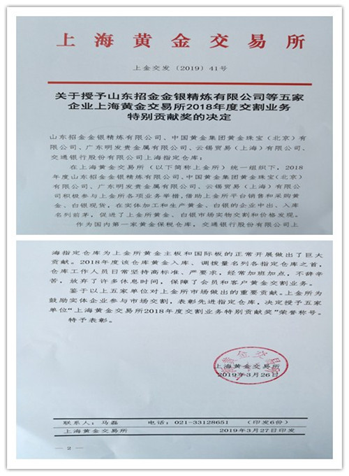 近日,云錫貿(mào)易(上海)有限公司榮獲上海黃金交易所授予的“上海黃金交易所2018年度交割業(yè)務(wù)特別貢獻(xiàn)獎(jiǎng)”。