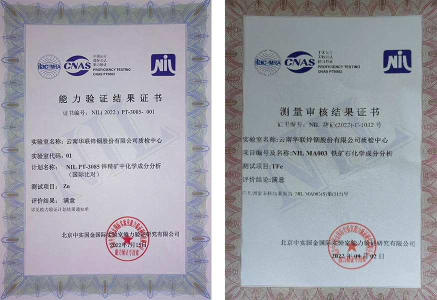 華聯(lián)鋅銦公司質(zhì)檢中心于2022年5月參加北京中實(shí)國金實(shí)驗(yàn)室能力驗(yàn)證研究有限公司申報(bào)的國家級(jí)實(shí)驗(yàn)室認(rèn)可領(lǐng)域檢測(cè)項(xiàng)目,并順利通過鋅精礦、鐵礦石化學(xué)成分分析國際檢測(cè)認(rèn)可。此次鋅精礦化學(xué)成分分析中Zn能力驗(yàn)證國際比對(duì),鐵礦石化學(xué)成分分析TFe測(cè)量審核,雙雙獲得評(píng)價(jià)結(jié)果為滿意的證書。