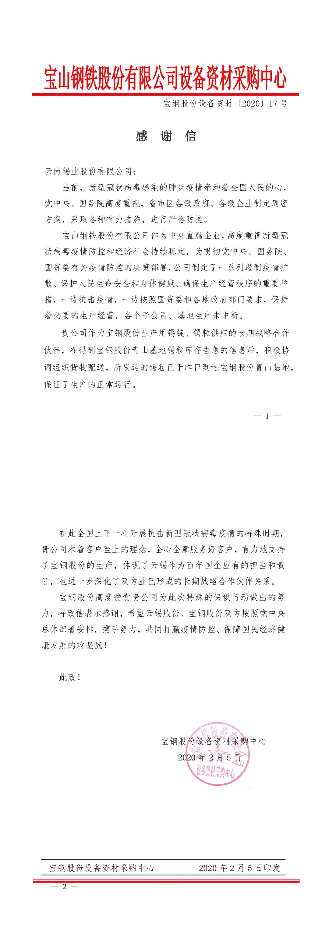 在存在諸多不確定因素的情況下,公司決定抱著嘗試的心態(tài)進(jìn)行配送,盡最大努力確保供貨。最后,在明確疫情期間需注意事項(xiàng),確保人員安全的前提下,配送貨車于2月2日從昆山出發(fā),最終順利通過檢查關(guān)卡,于2月4日將貨物安全交付武鋼新日鐵工廠,配送車輛也在武鋼的協(xié)助下順利離開武漢,返往昆山。公司在疫情期間采取特殊方式完成貨物配送,得到了客戶的高度認(rèn)可,寶鋼表示,患難見真情,感謝云錫對(duì)寶鋼原料保供的鼎力支持,并為此專門向錫業(yè)股份發(fā)來了感謝信。