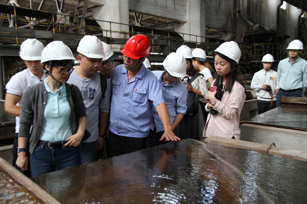 學員們先后參觀了熔煉車間精礦倉、反射爐舊址、頂吹爐主控室、精煉車間電熱連續(xù)結(jié)晶機、圓盤自動澆鑄機及錫庫,詳細了解了錫冶煉流程的設(shè)備原理、操作控制、工藝原理、入爐原料品位等方面情況。
