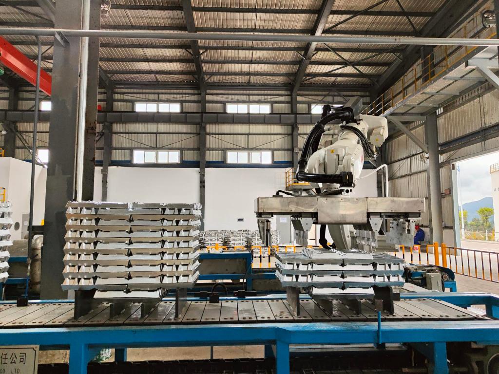 文山鋅銦年產(chǎn)3萬噸壓鑄鋅合金項目是云錫文山片區(qū)兩公司“倍增翻番”計劃項目之一,也是文山州2022年“四個三十”重點建設(shè)項目之一,同時也是公司依托年產(chǎn)10萬噸鋅冶煉熔鑄系統(tǒng)高效穩(wěn)定運行基礎(chǔ)優(yōu)化升級實施項目,采用先進、環(huán)保、節(jié)能的合金工藝和設(shè)備,主體設(shè)備選用“有芯感應(yīng)爐+可傾有芯感應(yīng)爐+電阻保溫爐”,配套液壓升降式加料裝置,合金爐自帶稱重保障精準(zhǔn)配料,探針聯(lián)鎖穩(wěn)定控制出液流量,機器人高效自動扒皮,風(fēng)冷搭配均水噴淋,激光打碼自動碼垛、打包、稱重、貼簽,全流程自動化高,控制精準(zhǔn),操作規(guī)范,精選99.996%以上鋅片搭配99.85%重熔鋁錠和99.95B鎂錠作為合金錠生產(chǎn)原料,與現(xiàn)有工藝實現(xiàn)閉環(huán),形成了一套完整的環(huán)保、低耗、資源綜合利用的冶煉產(chǎn)業(yè)鏈體系。該項目于2022年8月8日開工,10月9日點火烘爐,10月27日投料一次性產(chǎn)出合格產(chǎn)品,其產(chǎn)品表面光滑平整、斷面晶粒均勻、金屬質(zhì)感強、錠垛規(guī)整,物規(guī)質(zhì)量、化學(xué)成分穩(wěn)定,各項指標(biāo)明顯優(yōu)于國標(biāo)。