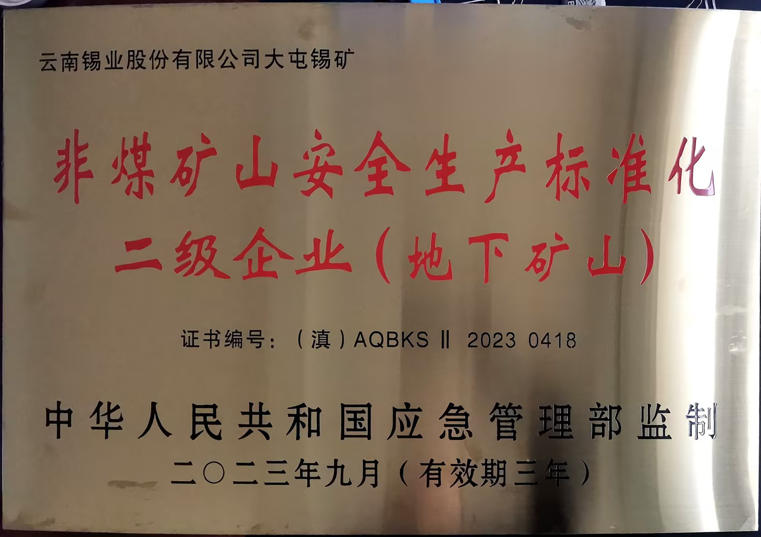 近日,錫業(yè)股份卡房分公司、大屯錫礦兩家單位收到由中華人民共和國應(yīng)急管理局監(jiān)制、云南省應(yīng)急管理廳頒發(fā)的牌匾和證書,正式確認(rèn)為“非煤礦山安全生產(chǎn)標(biāo)準(zhǔn)化二級企業(yè)”,為今后持續(xù)穩(wěn)定發(fā)展打下良好基礎(chǔ)。