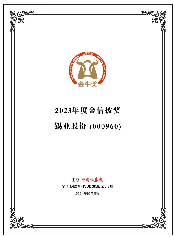 10月24日,中國(guó)證券報(bào)正式揭曉了2023年上市公司金牛獎(jiǎng)榜單,錫業(yè)股份(000960)榮獲“2023年度金信披獎(jiǎng)”。從評(píng)價(jià)結(jié)果統(tǒng)計(jì)來看,入圍參選樣本的4208家A股上市公司中僅有不超過450家獲獎(jiǎng),占入圍上市公司總數(shù)不到11%?!?023年度金信披獎(jiǎng)”評(píng)價(jià)重點(diǎn)考慮上市公司的信息披露質(zhì)量和效率。評(píng)選組委會(huì)根據(jù)上市公司年報(bào)質(zhì)量、審計(jì)情況、交易所信息披露考評(píng)等指標(biāo)進(jìn)行綜合判斷,并最終評(píng)選出在信息披露方面表現(xiàn)較為突出的上市公司。
