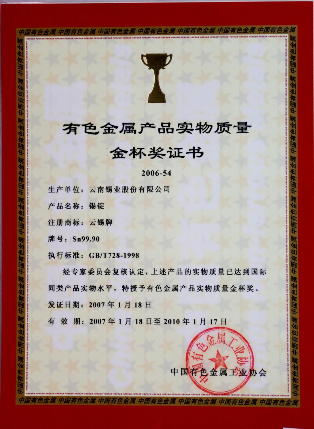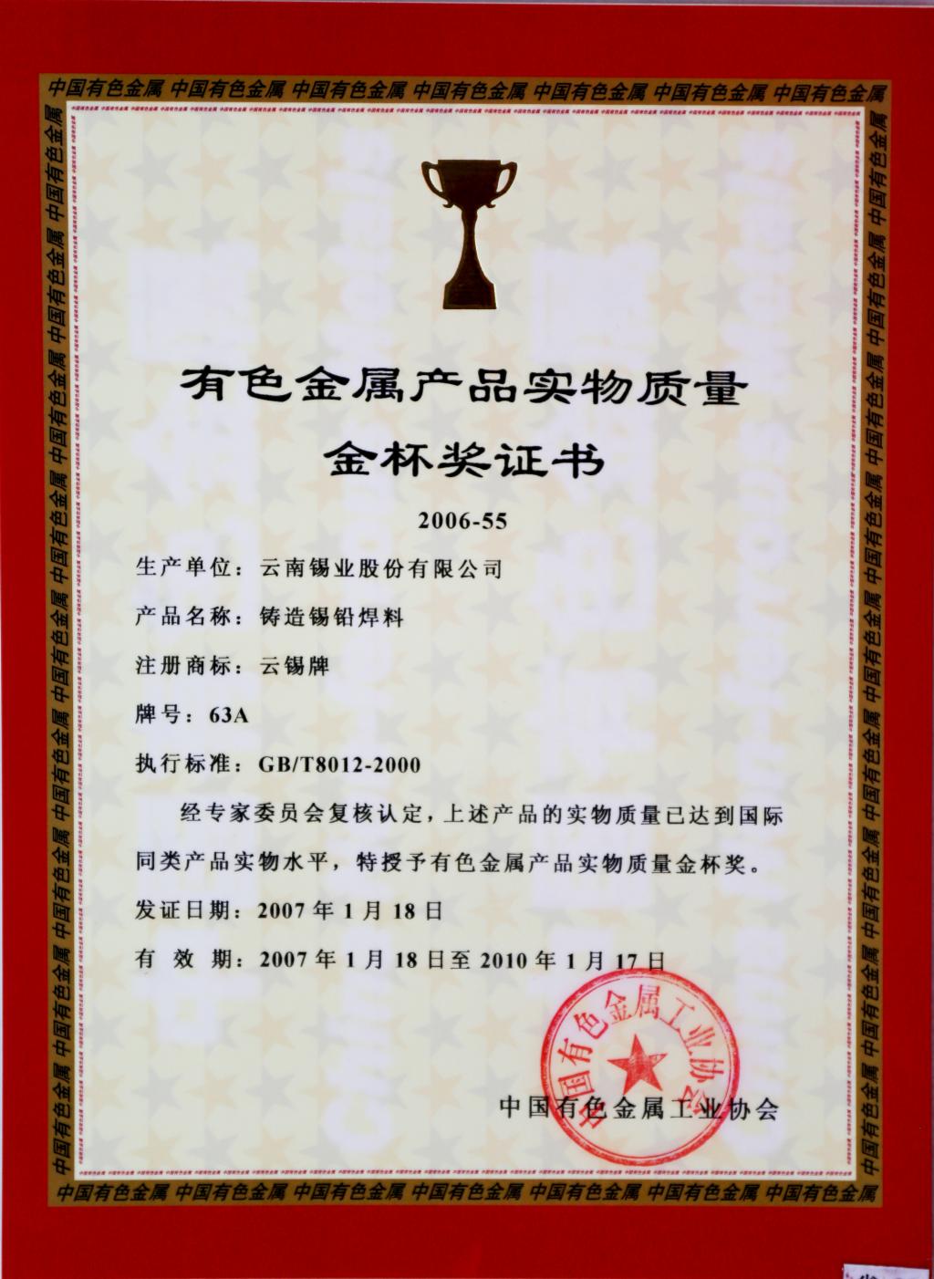 云錫牌鑄造錫鉛焊料獲有色金屬產(chǎn)品實(shí)物質(zhì)量金杯獎(jiǎng)證書(shū)