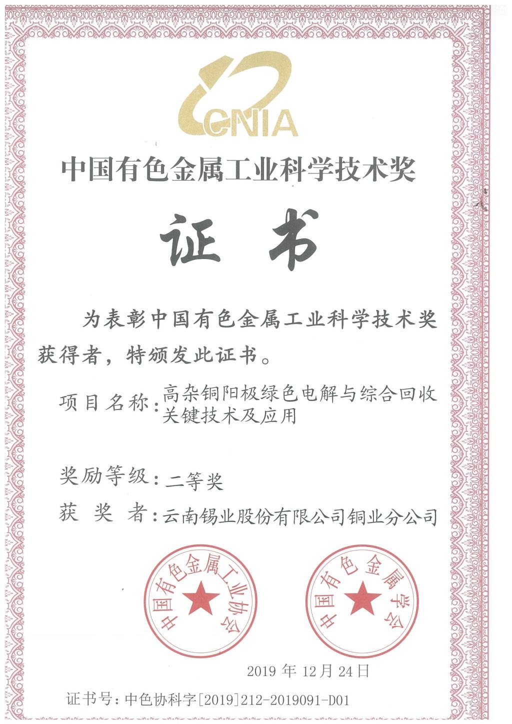 近日,銅業(yè)分公司收到中國(guó)有色金屬工業(yè)協(xié)會(huì)頒發(fā)的榮譽(yù)證書,銅業(yè)分公司申報(bào)的《高雜銅陽極綠色電解與綜合回收關(guān)鍵技術(shù)及應(yīng)用》榮獲中國(guó)有色金屬工業(yè)科技進(jìn)步二等獎(jiǎng)。