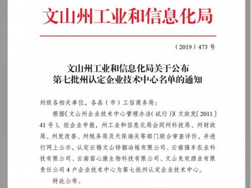 近日,云錫文山鋅銦冶煉有限公司同云南強(qiáng)豐農(nóng)業(yè)科技有限公司、云南苗心康生物科技有限公司、文山龍歡酒業(yè)有限責(zé)任公司4家企業(yè)獲第七批州認(rèn)定企業(yè)技術(shù)中心榮譽(yù)稱號。