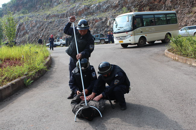 演練設(shè)置為早上9點(diǎn)30分左右,在通勤車乘坐點(diǎn),一群身份不明的人員在職工乘坐通勤車下班時(shí)進(jìn)行突然襲擊,對(duì)車間設(shè)施進(jìn)行破壞,其中3名“暴恐分子”在中巴車內(nèi)挾持了3名職工,守護(hù)精選工段的保衛(wèi)人員接到報(bào)警后,兩名保衛(wèi)人員立即對(duì)恐怖分子進(jìn)行阻擊,另外一名保衛(wèi)人員立即把情況上報(bào)給反恐小組辦公室,反恐領(lǐng)導(dǎo)小組迅速啟動(dòng)應(yīng)急方案。