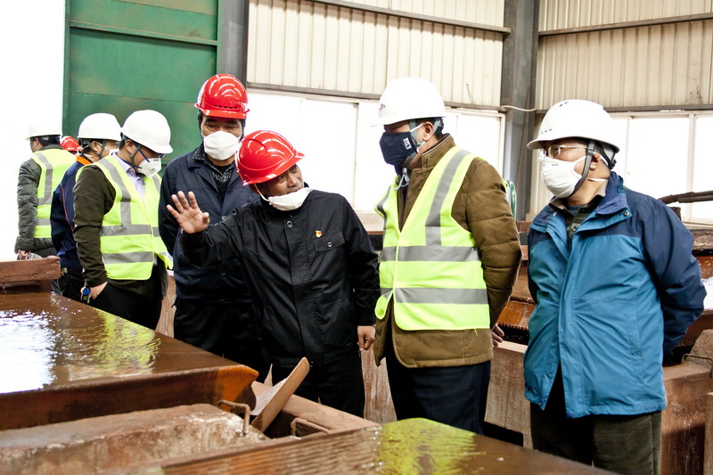 張濤到冶煉分公司,冶煉分公司黨委書(shū)記王嚴(yán),經(jīng)理王建偉,副經(jīng)理毛偉陪同考察。