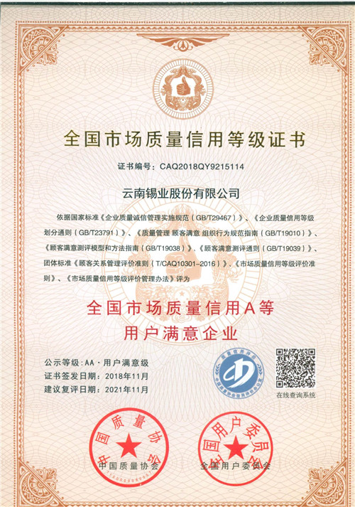 錫業(yè)股份積極參加中國質(zhì)量協(xié)會組織的“2018年度市場質(zhì)量信用等級評價”活動,通過企業(yè)申請、行業(yè)協(xié)會推薦、第三方專業(yè)機構(gòu)評價、專家評審、委員會審定、征詢意見等程序?qū)徍耍瑢ι陥笃髽I(yè)的質(zhì)量信用意愿、質(zhì)量保障能力、市場經(jīng)營能力等三個一級指標(biāo)及若干個二、三級指標(biāo)進行綜合評價,全面綜合考核企業(yè)的誠信建設(shè)與市場質(zhì)量信用管理能力和水平,錫業(yè)股份榮獲“2018全國市場質(zhì)量信用AA等用戶滿意企業(yè)” 榮譽證書及獎牌。