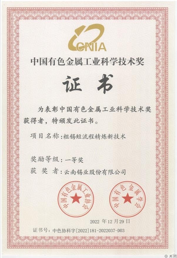 近日,中國有色金屬工業(yè)協(xié)會、中國有色金屬學會發(fā)布了榮獲2022年度中國有色金屬工業(yè)科學技術獎項目,由云錫控股公司牽頭負責,錫業(yè)股份錫業(yè)分公司、昆明理工大學、綠地環(huán)保共同參與的“粗錫短流程精煉新技術項目”榮獲2022年度“中國有色金屬工業(yè)科學技術獎一等獎”。