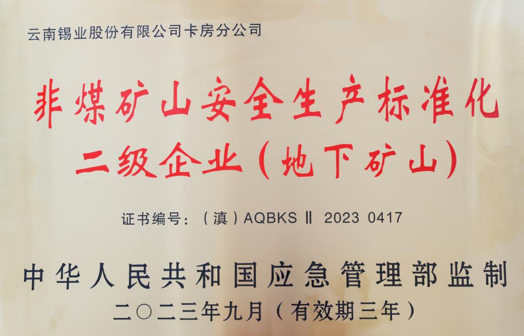 近日,錫業(yè)股份卡房分公司、大屯錫礦兩家單位收到由中華人民共和國應(yīng)急管理局監(jiān)制、云南省應(yīng)急管理廳頒發(fā)的牌匾和證書,正式確認(rèn)為“非煤礦山安全生產(chǎn)標(biāo)準(zhǔn)化二級企業(yè)”,為今后持續(xù)穩(wěn)定發(fā)展打下良好基礎(chǔ)。