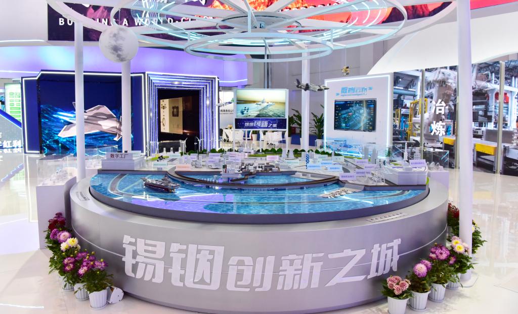 航母、衛(wèi)星、智能機器人……裸眼3D折角屏以極具視覺震撼的特效,生動展示錫基、銦基合金在大國重器制造中的應(yīng)用,成為制造業(yè)館的靚麗打卡點。