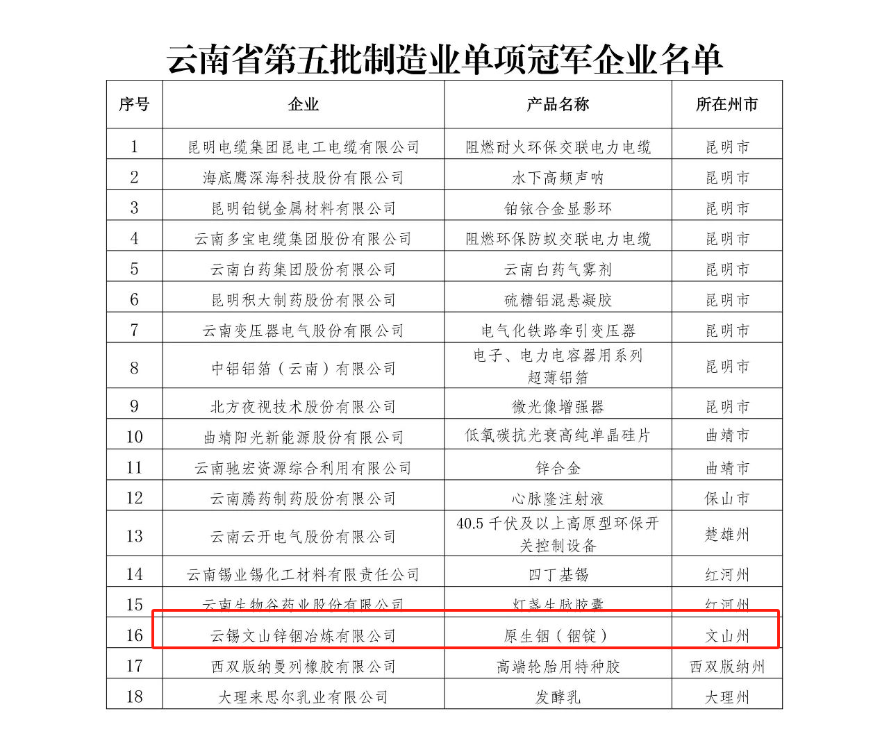 1月9日,云南省工業(yè)和信息化廳正式公布了“云南省第五批制造業(yè)單項冠軍企業(yè)名單”,文山鋅銦憑借在主導產(chǎn)品——原生銦(銦錠)領域的卓越貢獻與持續(xù)創(chuàng)新,榮獲“云南省第五批制造業(yè)單項冠軍企業(yè)”稱號。