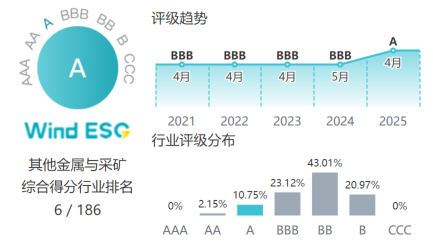 近日,萬得(Wind)更新了2025年最新ESG評級結(jié)果,錫業(yè)股份Wind ESG評級由過去連續(xù)4年的BBB級首次提升至A級,在金屬與采礦行業(yè)186家納評上市公司中目前排名第6(AA和A評級分別僅占2%和10%,目前暫無AAA評級企業(yè))。在此次評級中,錫業(yè)股份ESG綜合得分為7.91分,在環(huán)境、社會、治理三個維度得分分別為6.95、8.27、5.77,均處于行業(yè)前列。