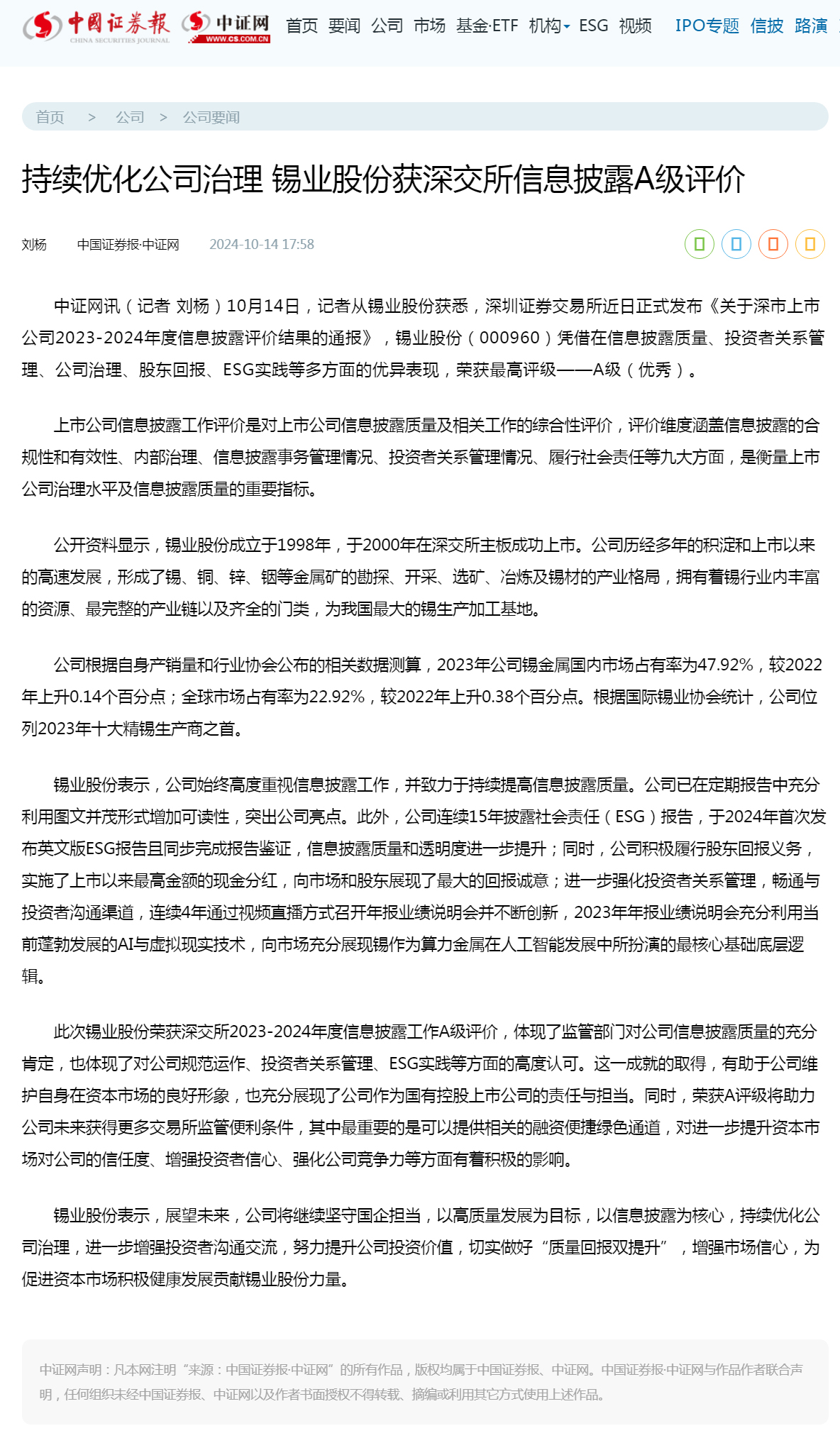 上一條:證券之星:錫業(yè)股份獲華證指數(shù)ESG最新評(píng)級(jí)A,行業(yè)排名第35
